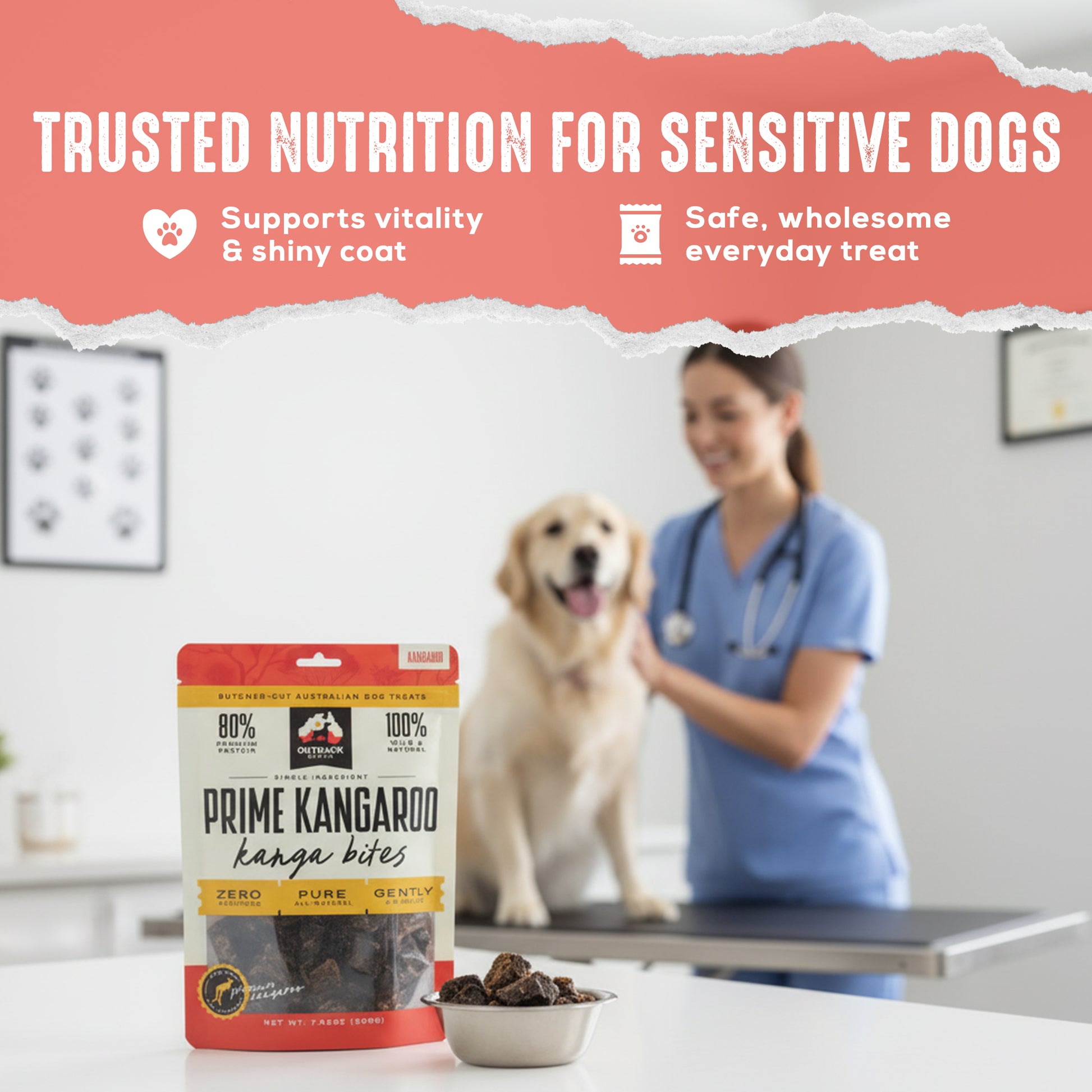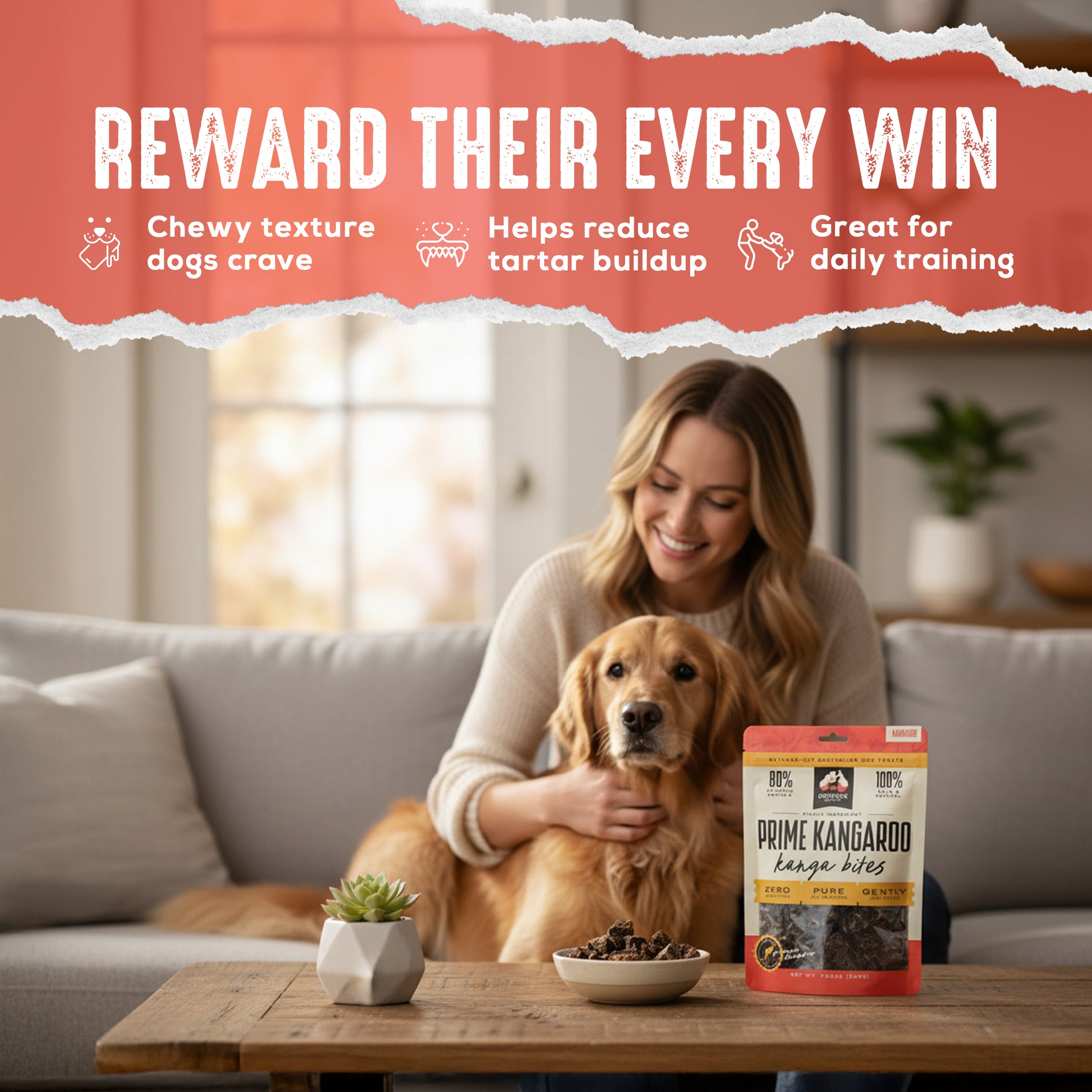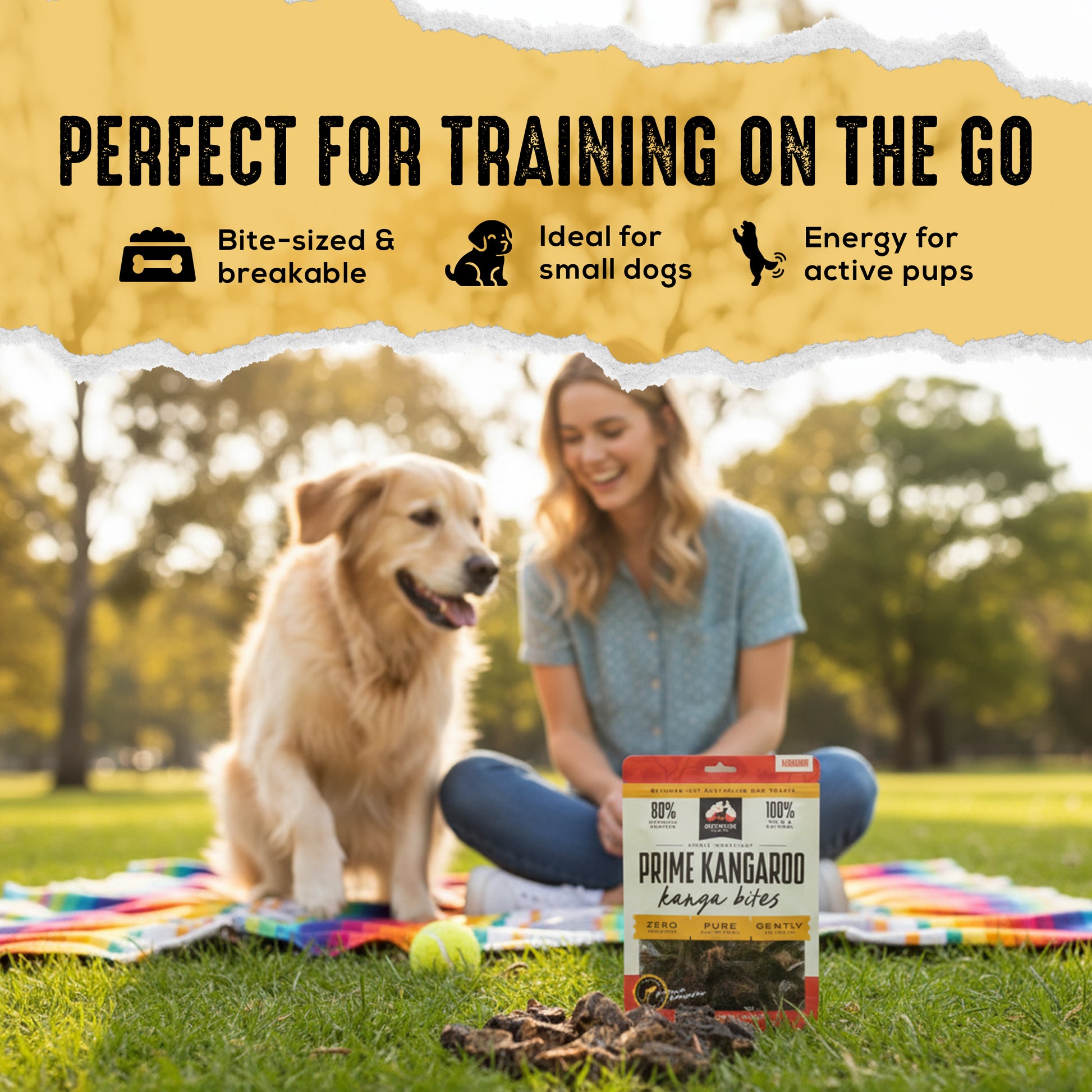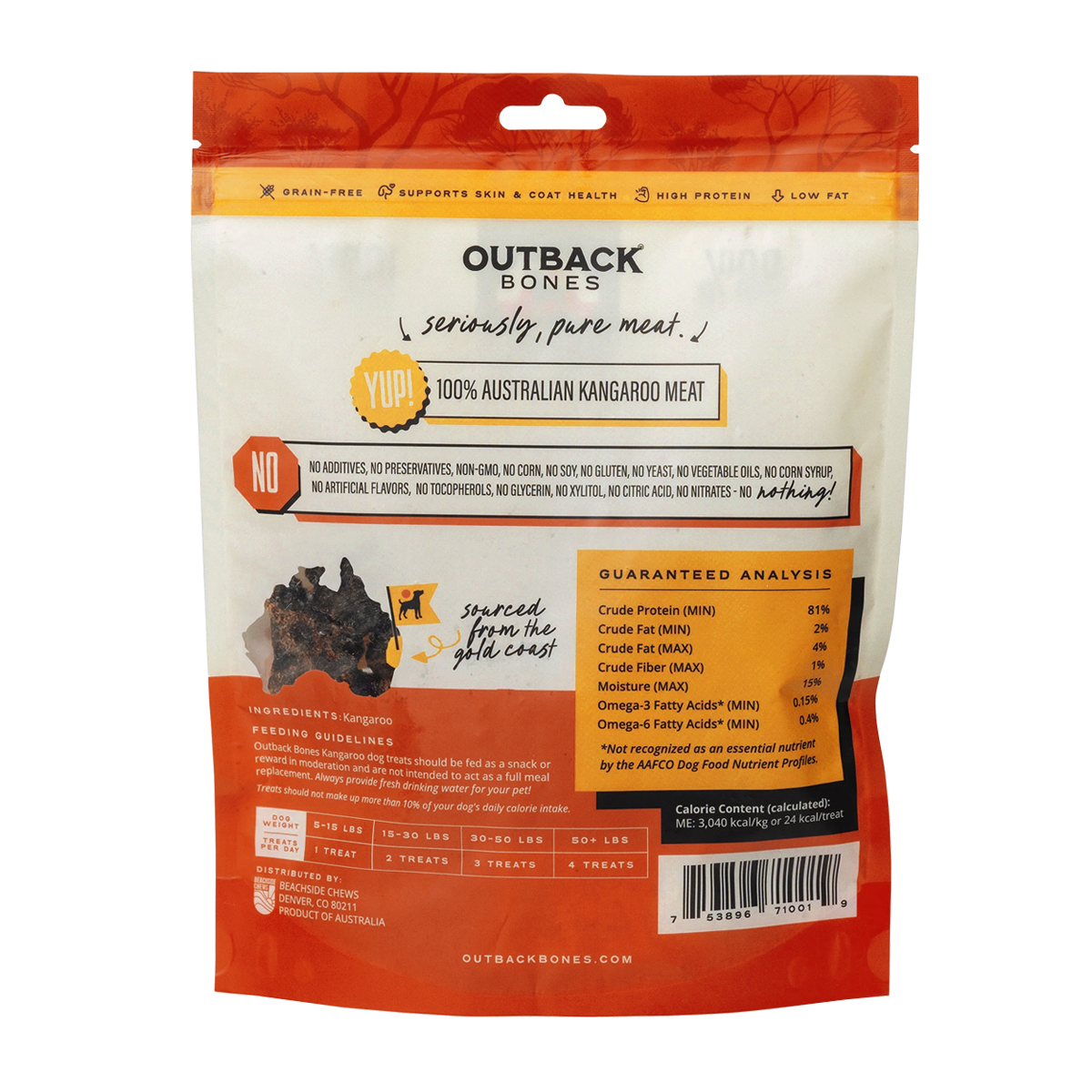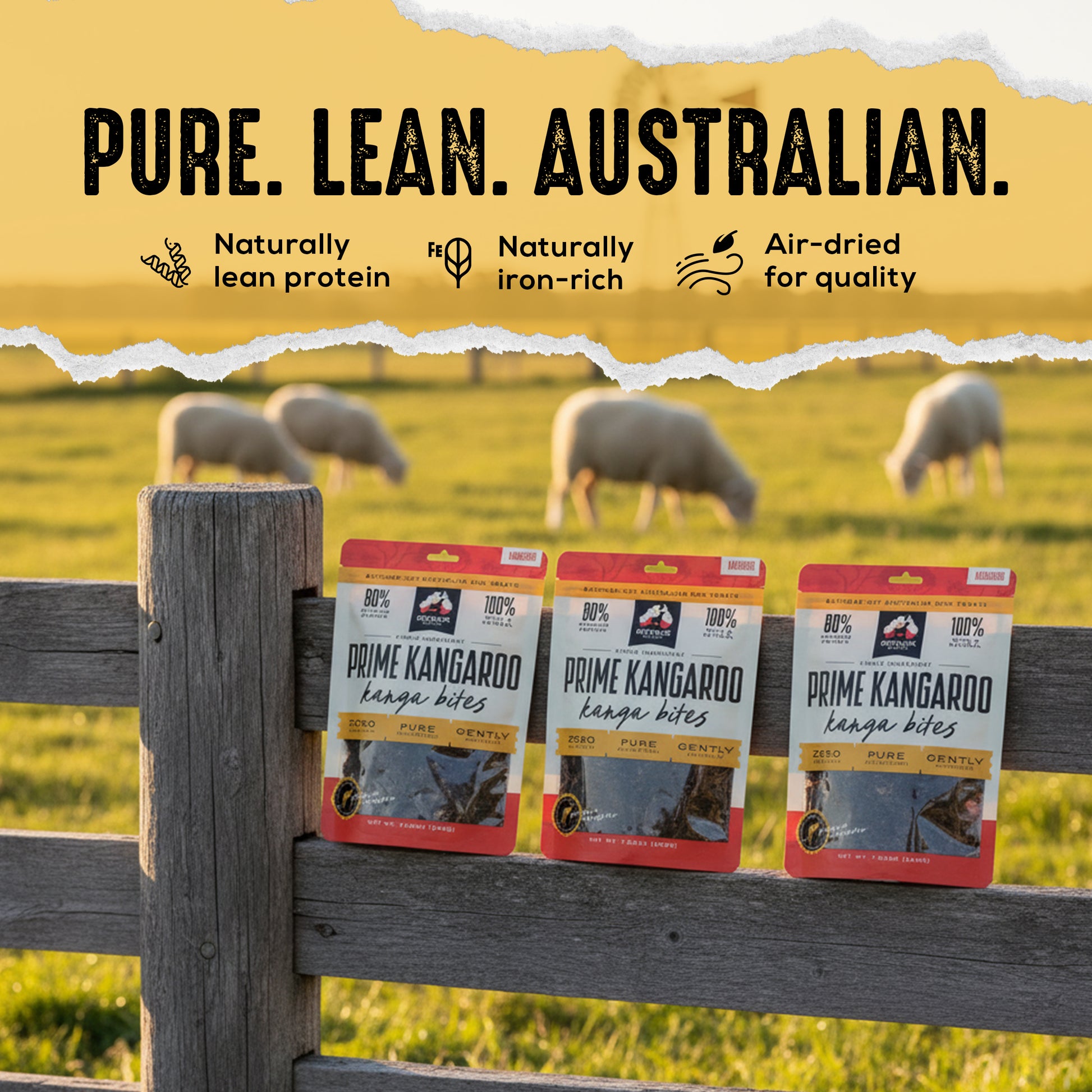 Outback Bones Prime Kangaroo Air Dried Jerky Bites are made from 100% wild kangaroo, a lean, nutrient-rich novel protein that’s gentle on sensitive stomachs and ideal for dogs with food sensitivities. Air dried for natural nutrition and a chewy texture, these bite-sized treats support dental health, energy, and a shiny coat without any fillers or additives.